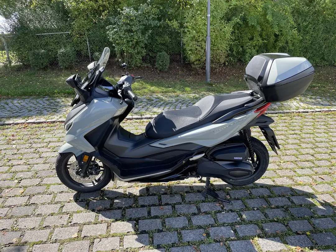 Die Forza ist in einem top Zustand, Scheckheft gepflegt und wurde schonend gefahren. Sehr umfangreich ist die Ausstattung u.a. mit Keyless go, eine auch im Fahrmodus um ca. 18 cm verstellbare Scheibe, Handyverbindung u.v.m. Das große Topcase und der enorme Stauraum unter der Sitzbank sind groß genug für jeweils einen Helm sowie einer Menge Accessoires. Eine kleine Beschädigung (Abrieb des Kunststoffs am Trittbrett rechts vorne (s. Bild 2) stammt von einer „Begegnung“ mit einem Blumenkübel.