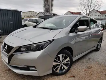 3. Bremsleuchte, Airbag Beifahrerseite, Airbag Fahrerseite, Akustischer Umfeldschutz (Außensound), Ambiente-Beleuchtung, Audio-/Radio-Fernbedienung am Lenkrad, Ausstattungs-Paket: Nissan Connect, Autom. Begleitfunktion der Beleuchtung (Follow me home), Automatische Fahrlichtschaltung, Außenspiegel anklappbar, Außenspiegel elektr. verstellbar, Außenspiegel Wagenfarbe, Außentemperaturanzeige, Blinkleuchte in Außenspiegel integriert, Bluetooth-Schnittstelle, Dachantenne, Elektr. Bremskraftverteilung (EBD), Elektromotor 110 kW (cont. 90 kW), Fahrassistenz-System: aktiver Spurhalteassistent, mit korrigierendem Bremseingriff, Fahrassistenz-System: Autonomer Notbrems-Assistent, Fahrassistenz-System: Berganfahr-Assistent, Fahrassistenz-System: Fernlichtassistent, Fahrassistenz-System: Moving Object Detection (MOD, Fußgängererkennung und bewegliche Objekterkennung), Fahrassistenz-System: Querverkehrs-Assistent Heck (Rear Cross Traffic Alert, RCTA), Fahrassistenz-System: Totwinkel-Assistent, Fahrassistenz-System: Verkehrszeichenerkennung, Fahrer-Informations-System (FIS) mit Farbdisplay, Fensterheber elektrisch vorn + hinten, Frontscheibe Verbundglas, Getränkehalter hinten, Getränkehalter in Mittelkonsole, Getränkehalter vorn, Gurtstraffer, Handschuhfach beleuchtet, Heckleuchten LED, Heckscheibe heizbar, HV-Batterie 40 kWh, Innenspiegel abblendbar, Isofix-Aufnahmen für Kindersitz, Karosserie: 5-türig, Klimaautomatik, Kofferraumabdeckung, Kopf-Airbag-System, Kopfstützen vorn und hinten verstellbar, Ladekabel mit Schukostecker (Mode 2), Ladekabel mit Typ 2-Stecker (Mode 3), Ladevorrichtung Wechselstrom (bis 6,6 kW), Lenksäule (Lenkrad) höhenverstellbar, LM-Felgen, Nebelschlussleuchte, Parkbremse manuell, Reifendruck-Kontrollsystem, Rückfahrkamera, Rücksitz geteilt/klappbar, Schnellladevorrichtung, Seitenairbag, Sitz vorn links höhenverstellbar, Sitzbezug / Polsterung: Stoff, Smartphone Schnittstelle (Apple CarPlay & Android Auto), Sonnenblenden mit Spiegel (beleuchtet), Start-Stop-Knopf, Steckdose (12V-Anschluß) in Mittelkonsole, Touchscreen-Farbdisplay (7,0 Zoll) in Mittelkonsole, Türgriffe außen verchromt, Wärmeschutzverglasung mit UV-Schutz